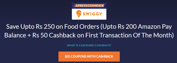 You Can Combine Upto Rs.200 Amazon Cashback offer + Rs.50 Cashkaro Cashback + Rs.25 on Signup at Cashkaro + 50% Off Swiggy Coupon Codes & This sounds delicious to me. Let’s see in details.