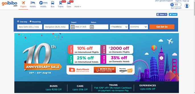 GOIBIBO OFFER: 10th Anniversary Sale (20th-23rd Aug): Upto Rs 1,500 Off Code on Domestic Flights + Flat Rs 126 CashKaro Cashback