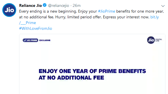 […] Jio extended validity of prime mebbership to March 2019 without any extra fee. Enjoy Jio, Here is the official tweet fro Jio Click Here to Know how To Extend Validity Of your Jio Prime Membership For Free For One Year Up To&n… […]